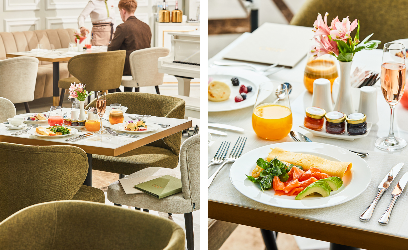 Ждем на продолжительный завтрак не только гостей отеля, но и петербуржцев, кто решит начать день со вкусом. Стоимость завтрака — 4 300 руб. на персону. В нее входят блюда меню a la carte, шведская линия и напитки.